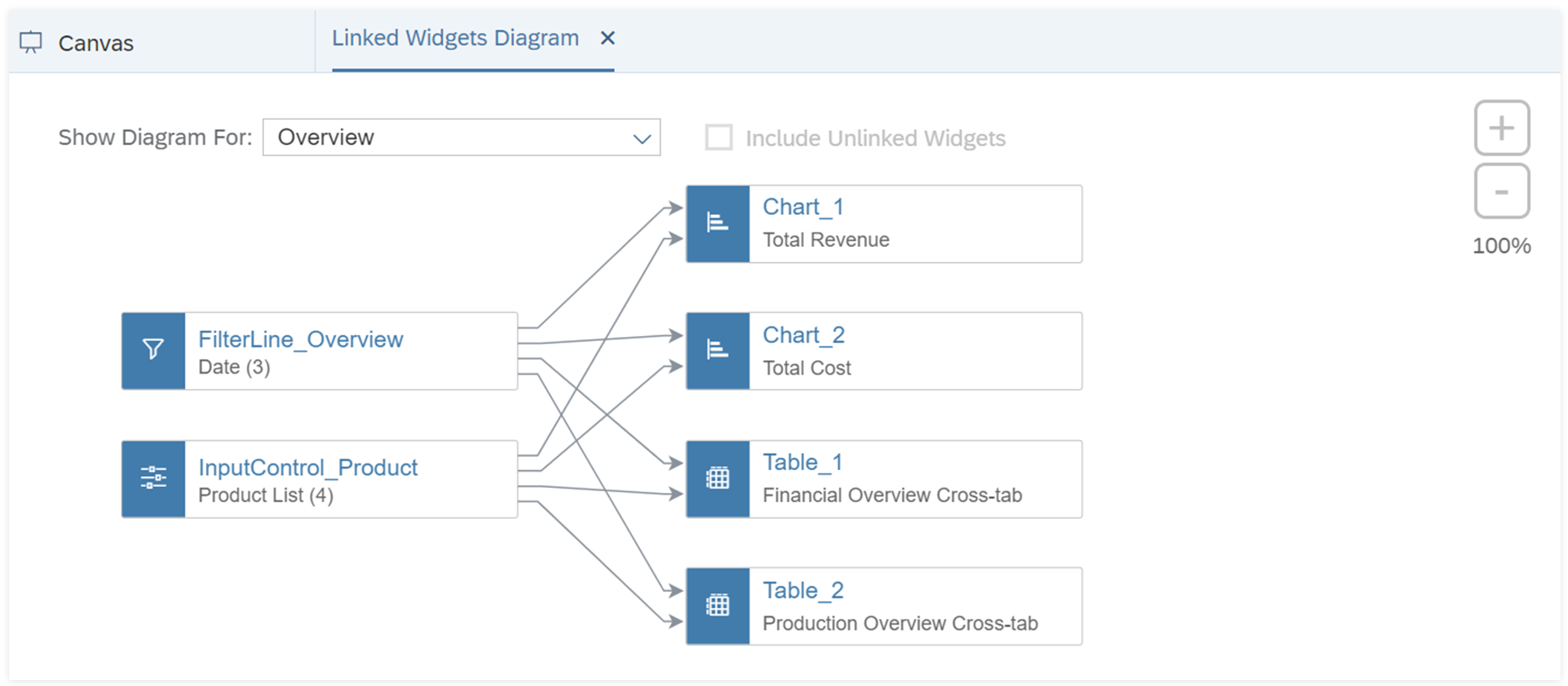 With linked widgets diagram, you can both view and modify the existing widget relationships.