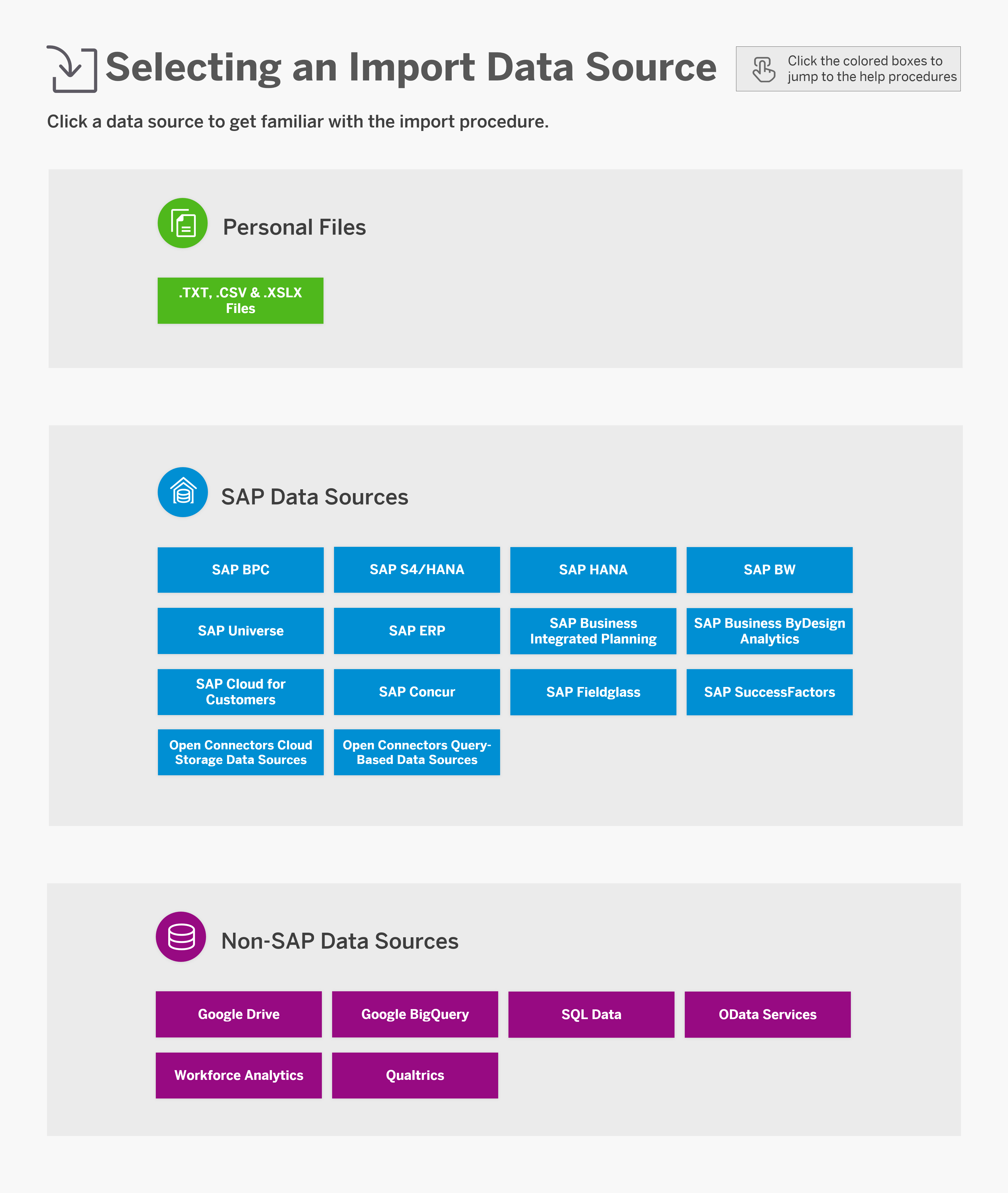 This section only describes how to import data to a model. After you import data, it must be prepared so that it's ready to be consumed both in models and stories. For more information about data preparation, check out Import and Prepare Fact Data for a Classic Account Model, or Import and Prepare Fact Data for a Model with Measures.