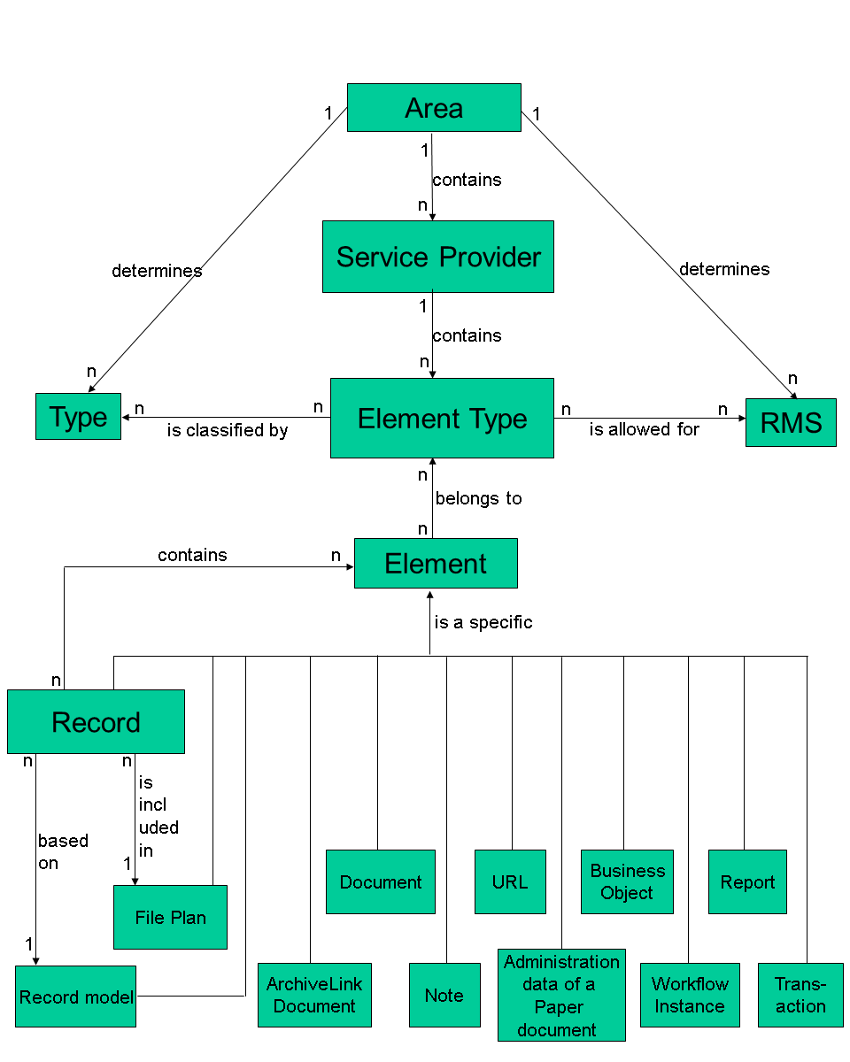 Service providers enable integration of elements into Records Management and access to elements. Each service provider is responsible for a particular group of elements. (examples: Service provider for documents, service provider for notes, service provider for business objects). Within a service provider, you can adapt element types to further subdivide this group.