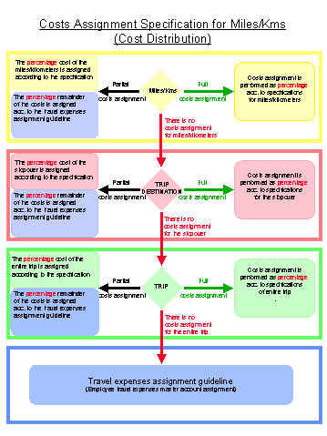 Costs Assignment Specification for Miles/KilometersThe cost assignment specification per miles/kilometers (per trip segment) makes it possible for you to specify, for a trip segment, a percentage cost assignment that differs from the travel expenses assignment guideline.
