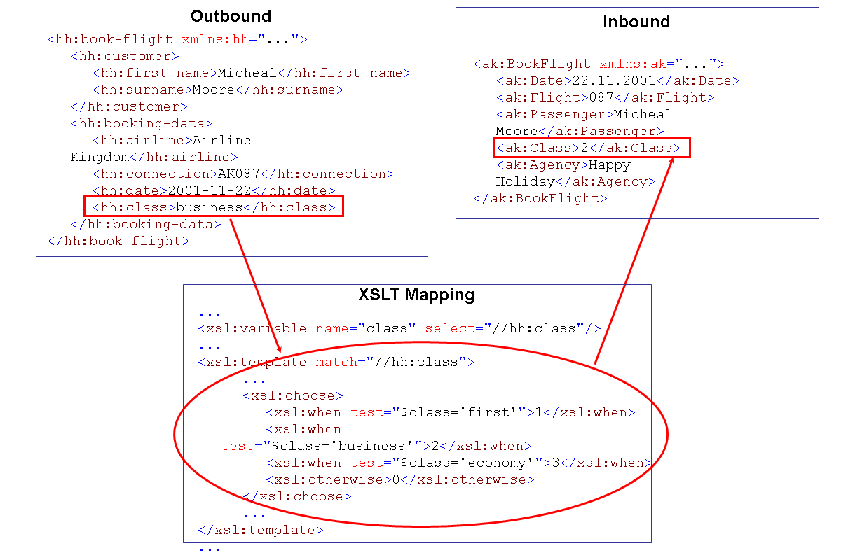 The function for booking a flight contains a parameter for the flight class. The outbound interface represents flight classes as symbolic values; in the inbound interface, flight classes have numerical values. The XSLT section converts the symbolic representation of the source system into the numerical representation of the target system.