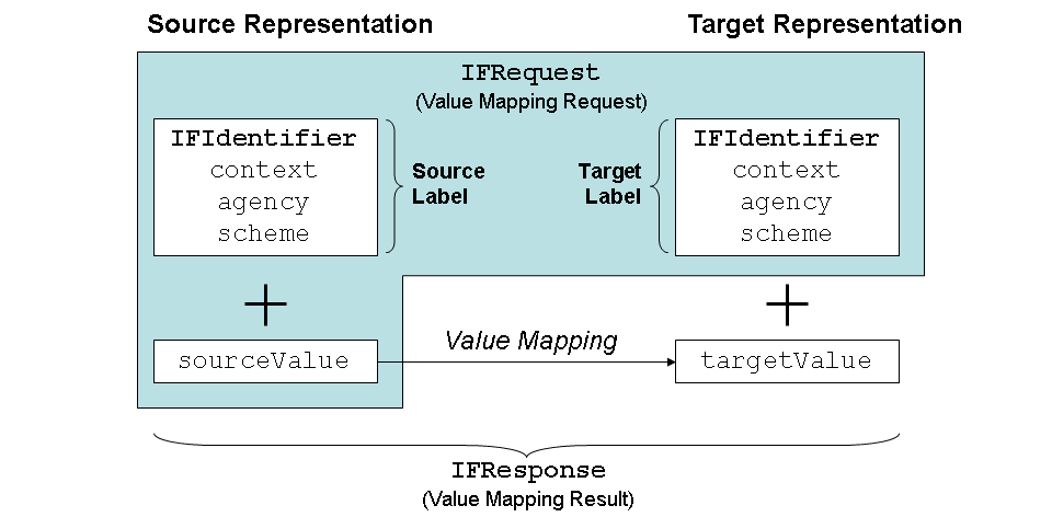 The package com.sap.aii.mapping.value.api contains the interfaces IFIdentifier , IFRequest , and IFResponse . You request objects for these interfaces to describe such representations. You use IFIdentifier to construct IFRequest , and when you execute the value mapping an object of type IFResponse is returned.