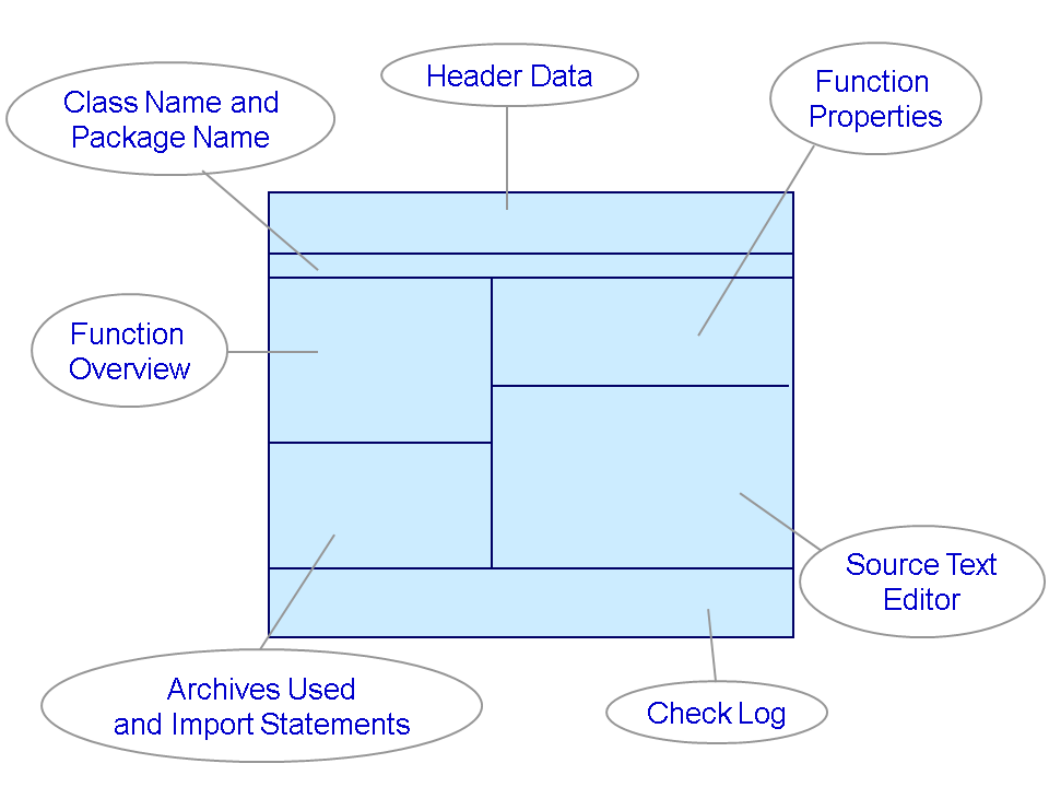 The ES Builder has an integrated editor for creating Java source text for the functions contained in a function library. You can also use an external tool to edit the source text of a function library. To do this, you export the source text and reimport it once you have edited it using the external tool.