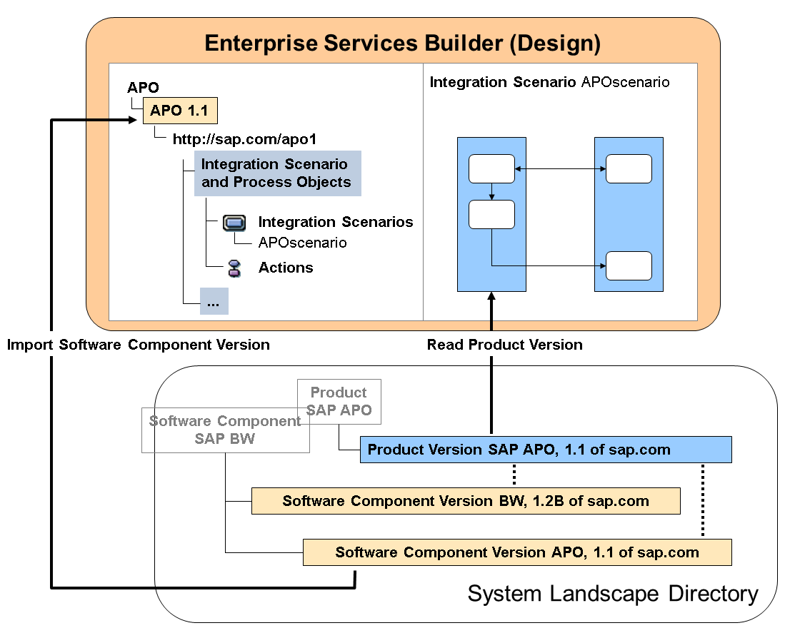 In this example, the product version SAPAPO 1.1 comprises the software component versions BW 1.2B and APO 1.1. The corresponding information about the product version is located in the System Landscape Directory. Since not all software component versions from the System Landscape Directory are relevant for the Enterprise Services Repository, you must selectively import those software component versions that are to be made available from the Enterprise Services Repository content (ESRcontent). Once you have imported these software component versions they are displayed in the navigation tree. The graphic shows the expanded hierarchy for software component version APO1.1. The development of design objects in the ES Builder is therefore primarily associated with the software component versions.