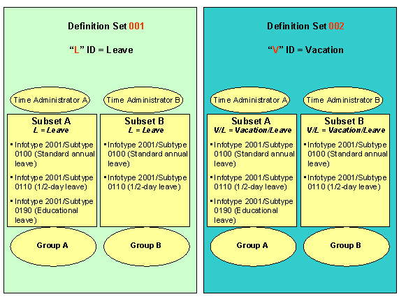 Time administrators in Group A need to use all three of these IDs to maintain their time data. No educational leave is permitted in Group B , so time administrators in this group do not use the specification "educational leave." You create subset A for Group A, and subset B for Group B.
