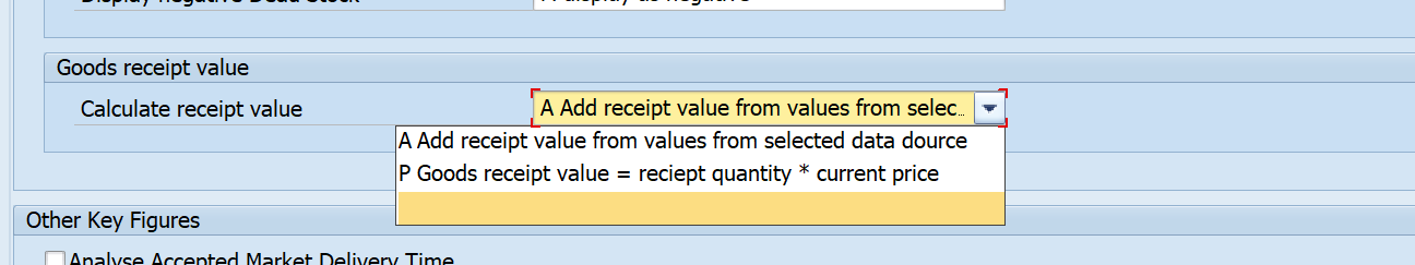The goods receipt value quantifies the value of the receipts in the analysis period. This key figure is determined only if you select the material documents as data source. You can choose between the following two calculation options: