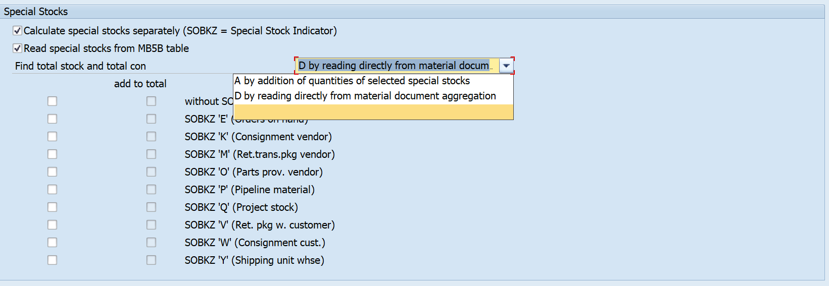 On the Special Stock tab, you can specify how special stock is to be handled. This option is only possible in combination with material document aggregation (see the section on selecting special stock for material document aggregation – this is contained in the documentation for the comprehensive functions).