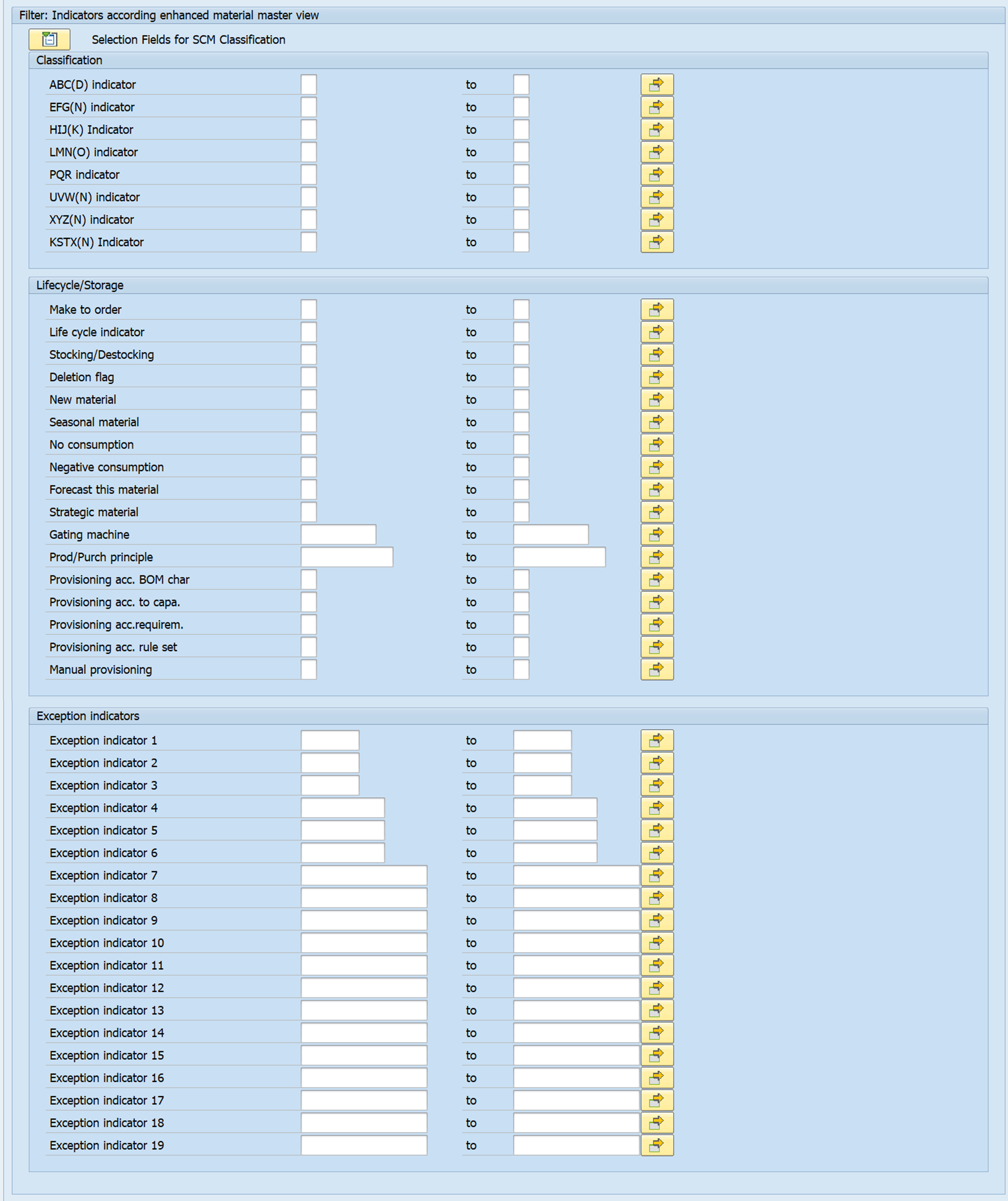 The current release also offers the classifications currently saved in the enhanced material master view as well as other characteristics/key figures as further selection options. These include: