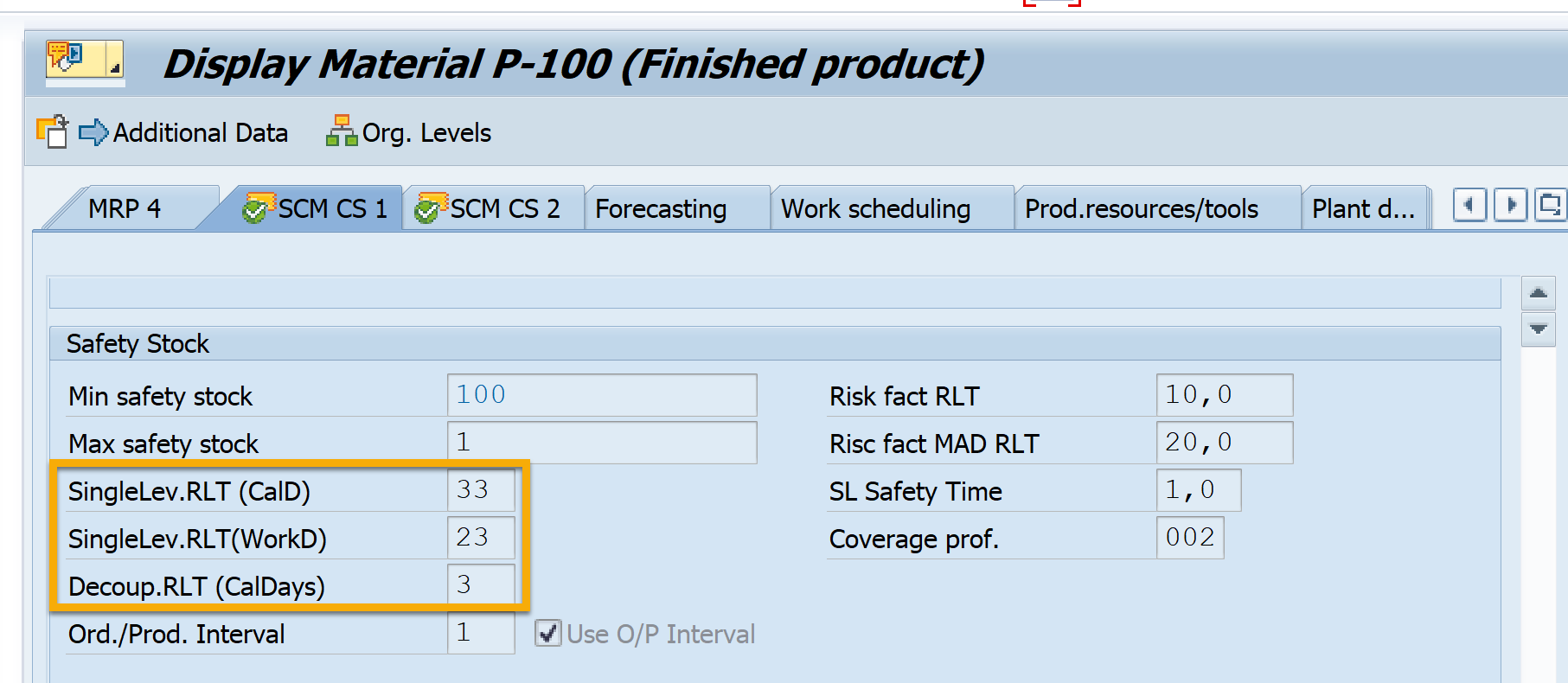 The parameters Decoupled RLT (CD), One-Level RLT (CD), and One-Level RLT (WD) are read from the enhanced material master view.