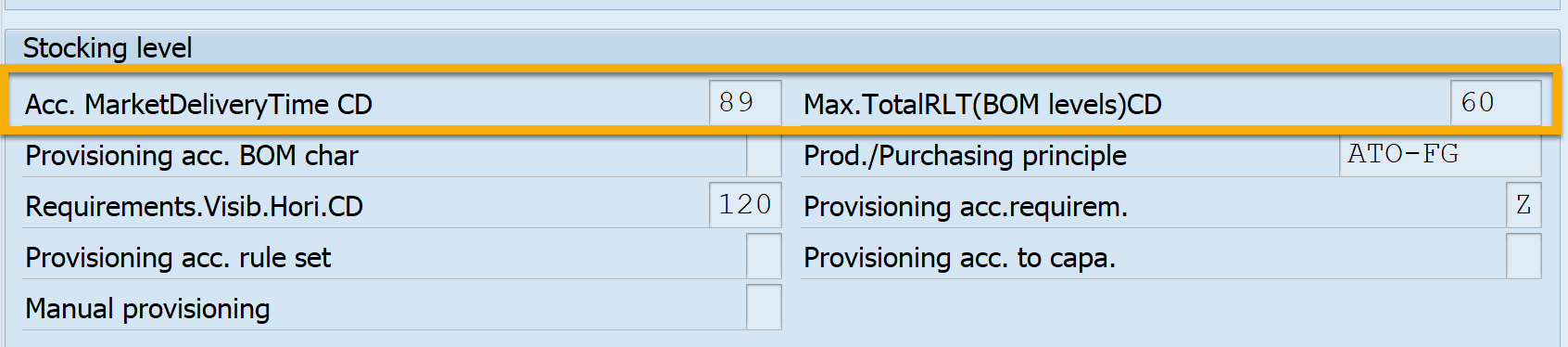 SLM now uses the cumulated replenishment lead times over several BOM levels to check when stocking should take place. Relevant parameters that are checked are the Accepted Market Delivery Time and Maximum Total Replenishment Lead Time. You can determine these parameters yourself in planning and maintain them in the enhanced material master view. Both values are maintained in calendar days. It is also possible to work with only one of the two parameters.