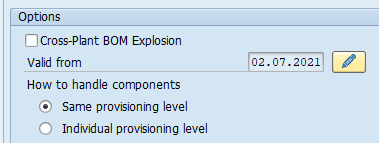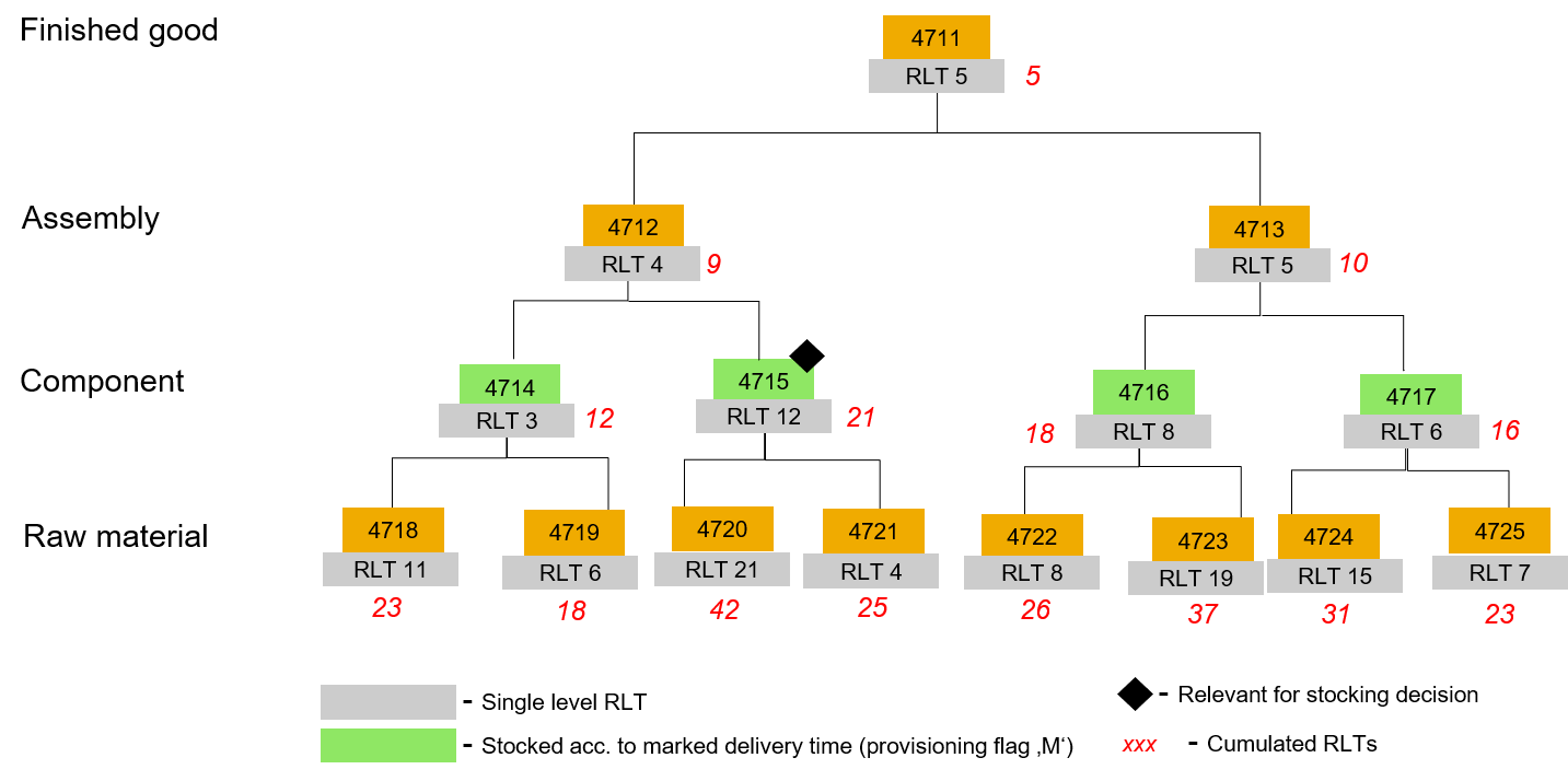 As soon as the stocking indicator is set for a material of a BOM level according to the accepted market delivery time or the accepted total replenishment lead time, it is also set for all other materials of the same level in the same way. The SLM ends the analysis and lower BOM levels are not checked or stocked further.