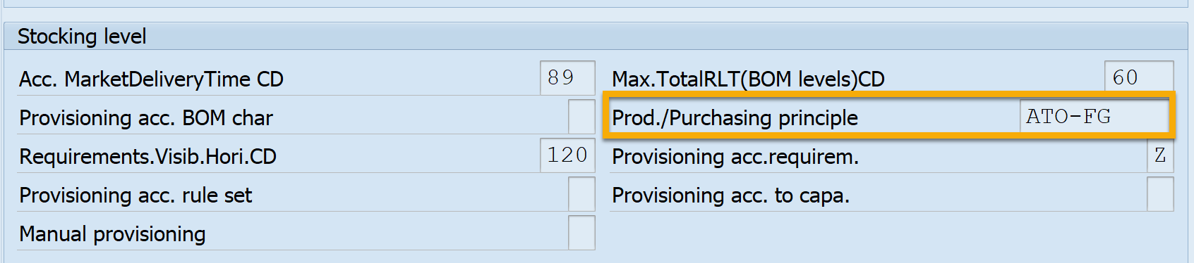 Based on the determined stocking indicators and the material characteristics, "procurement type", "special stock indicator", and "BOM level", the manufacturing/procurement principle can be identified in the stock level monitor and saved in the enhanced material master view.