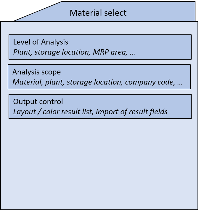 The Material Selection tab determines the data for the business analyses. Here you specify the analysis level, the area of analysis, and the output control.