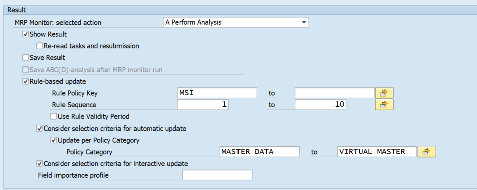 With the Automatic Rule-Set-Based Update option, you can update the selected materials after the MRP monitor run, in accordance with the rules defined in transaction /SAPLOM/XMM_RULE. The materials that fulfill the rule conditions are updated automatically with the specified parameters of the rule applied.