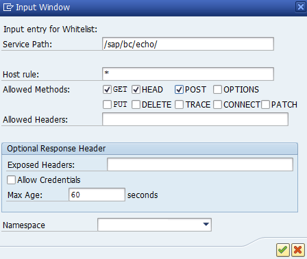 - In the <Optional Response Header> frame, you can specify whether additional <exposed headers> are made accessible (separated by commas) and (in the case of Preflight queries) whether user logon data is allowed (<Allow Credentials>). For Preflight queries, you can also specify the maximum number of seconds (<Max. Age>) in which the response can be cached (the default is 60).