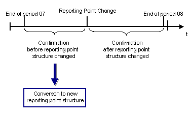 When you do this, the system compares the old reporting point structure with the new reporting point structure, and converts the reporting point backflushes of the current period to reflect the new reporting point structure.