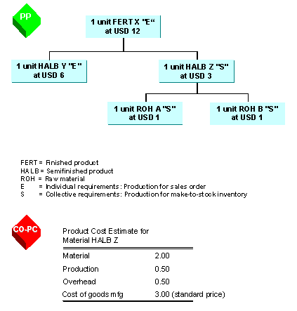 Example: Nonvaluated Sales Order StockBOM of Finished Product FERT X (Individual Requirements) and Valuation Basis of Semifinished Product HALB S (Collective Requirements)