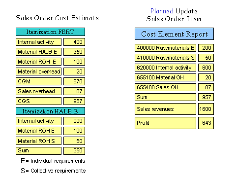 The system updates the planned costs calculated in the sales order cost estimate to the sales order item in the form of cost elements and costing items. A requirement is that the sales order item is flagged as carrying costs and revenues .