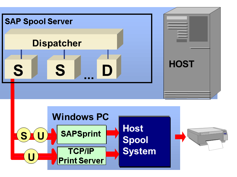 SAPSprint and TCP/IP Print Server accept the data stream and forward it to the host spool system (operating system spooler).