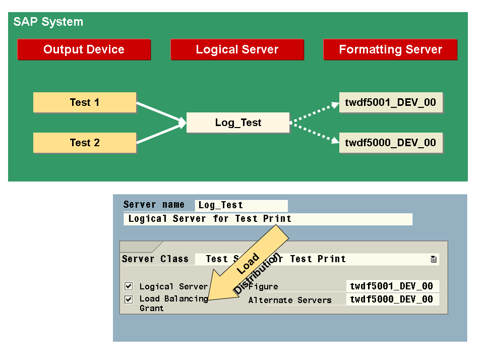 The server is overloaded; the system balances the output workload over the actual server and the alternative server. However, to do this, you must activate the Allow Load Balancing option in the definition of the spool server. By default, this option is not activated to ensure that requests are processed in the order in which they are created.