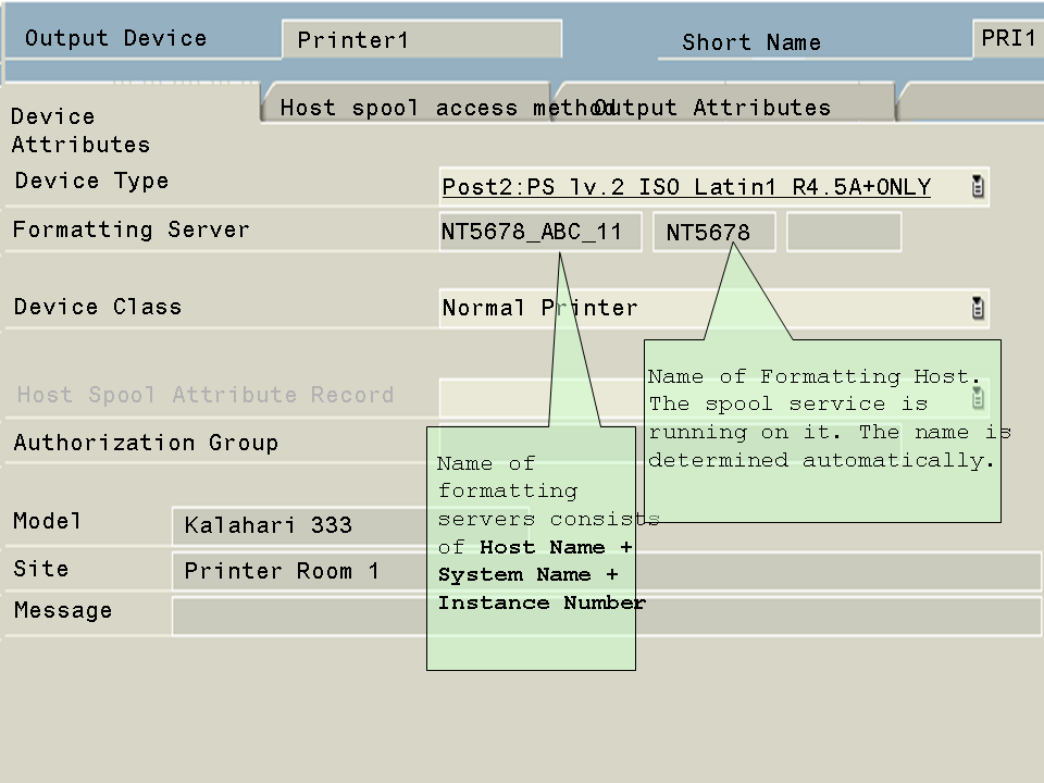 Specify the name of the output device and fill out the mandatory fields of the individual tab pages as follows: