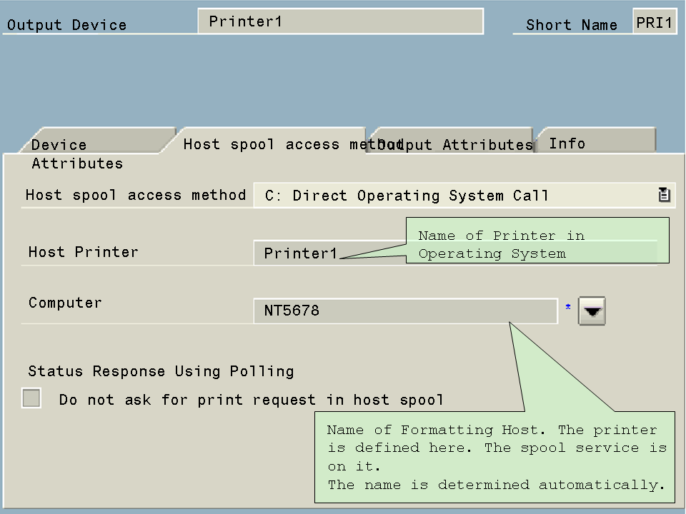 As the host spool system and the spool server are on the same server, the name of the same server appears on both tab pages. In this example, the printer also has the same name both in the SAP System and in the operating system.