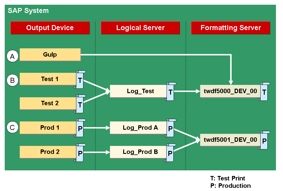 Transporting the Print Landscape Between Systems: Unlike real servers, logical servers can have the same names in different SAP Systems. You can therefore define a uniform SAP print architecture using logical servers and then transport this to all of your systems.