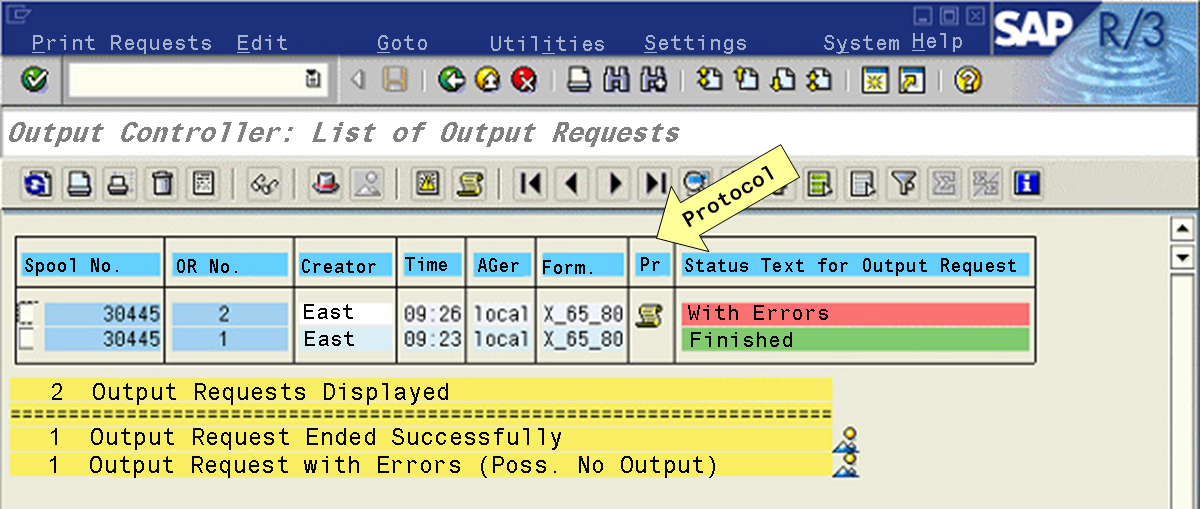 Using the Output Requests tab page on the initial screen of the output controller ( transaction SP01); see Selecting and Displaying Spool.