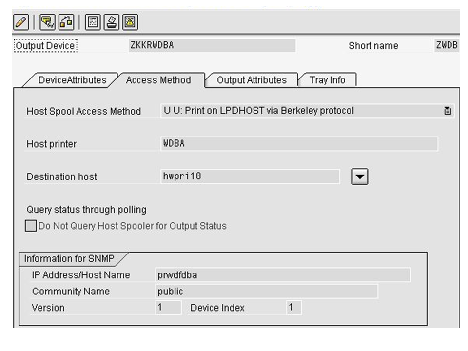 The content of the field Host printer must match the name of the output device as it is defined to the Windows machine on which SAPSprint is running. Otherwise SAPSprint will not be able to find the output device and cannot retrieve its status. If it is connected to the SAPSprint hosting machine via a print server, make sure you specify this server as well (like \\servername\printername).