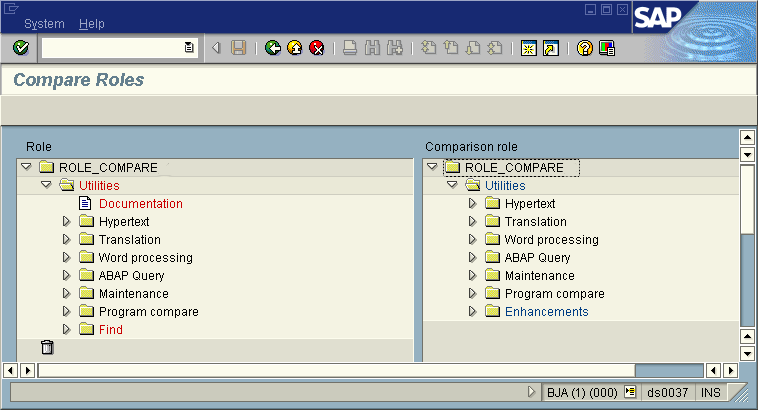In the new role imported, the entry Enhancements is shown in blue. This entry is missing in the role to be adjusted and can be inserted with Drag & Drop into that role at the appropriate position.