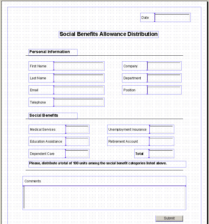 When you design a composite form, you have to associate it with a specific form template from which form instances are generated at runtime. This example shows you how to model the layout of a form for distribution of social benefits.