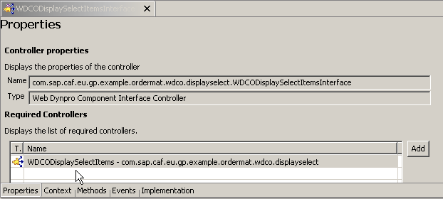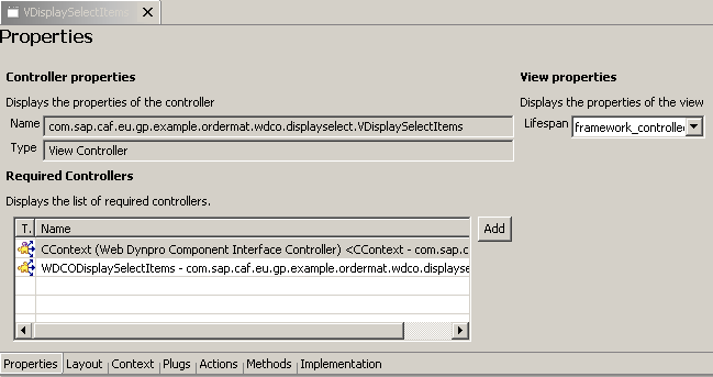 The user interface of the component is implemented in view VDisplaySelectItems. The view is embedded in WebDynproCO that has been created when adding the implemented interface.