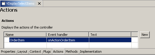 An action OrderItem is defined for the view. The action usage is discussed in the Layout section below. The implementation of the event handlers is shown in the Implementation section.