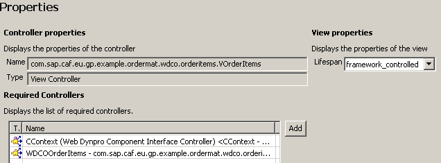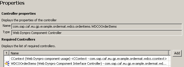The user interface of the component is implemented in view VOrderItems. The view is embedded in WebDynproCO that has been created when adding the implemented interface.