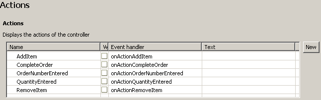 The first and the last columns contain input fields, in which the purchasers can enter the order number of the item, and the required quantity respectively. The input fields are linked to the relevant attributes in the view's context ( orderNumber and quantity in structure ItemsList). In addition, they reference the OrderNumberEntered and QuantityEntered actions, so that a specific behaviour can be implemented when the user enters input in either of the fields. The implementation of the relevant event handlers is discussed in the Implementation section below.