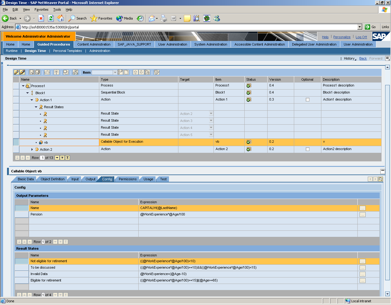 You use the Business Logic callable object type to make process flow decisions based on dynamic expressions. They can be defined for output parameters and result states and are evaluated at runtime depending on the actual values of the input parameters. This is possible without any coding or use of an external rule engine.