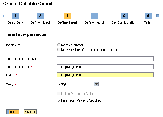 Define the input parameters. You need to insert parameter pictogram_name for this BSP application as shown in the example.