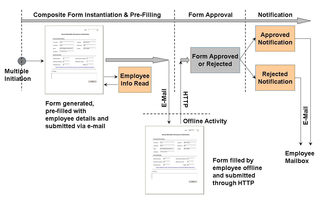 - Offline step: The employee receives the form, fills in the appropriate values for each social benefit category, and submits the form through HTTP using the Submit button. Only after the form is submitted does the process continue with step 3.