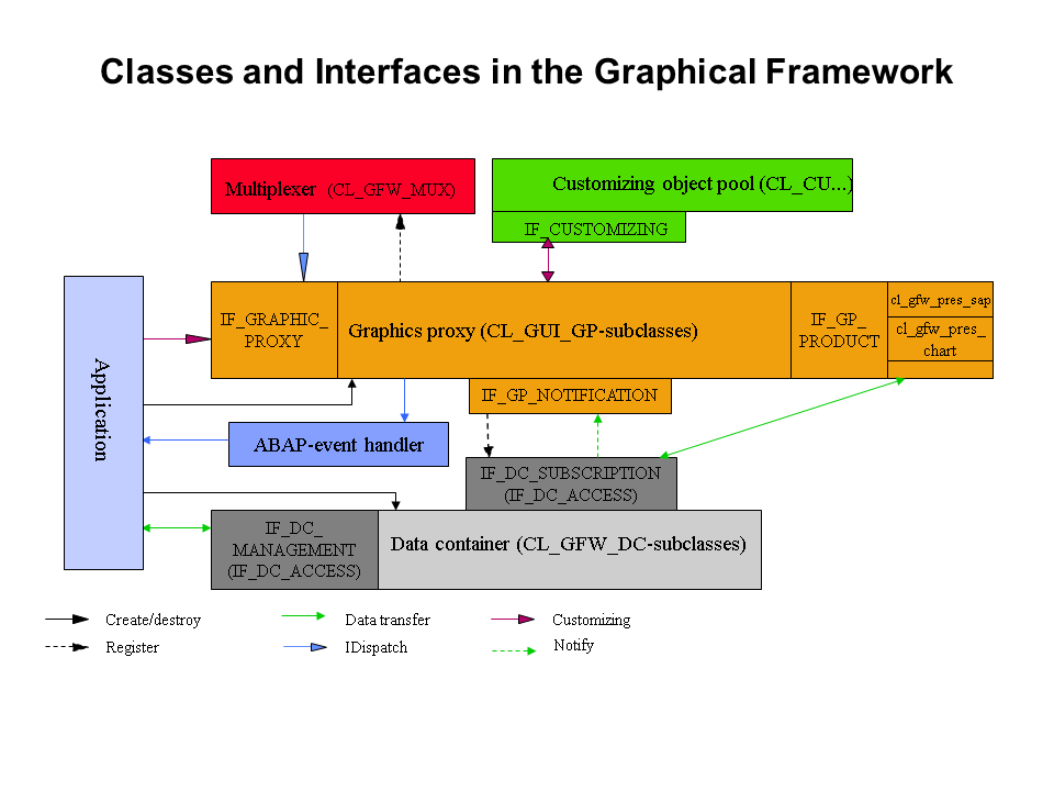 If you change data by interactively changing the graphical object then the application is informed of the change to the data and can query the data container concerning the changes. The advantage of this technology is that the event parameters of the graphical objects need not be known to the application and any change is represented only in the data. If the application validates and accepts the change to the data the data container distributes the changed data to the graphics proxies that are registered with it (using the notify mechanism). The same mechanism is used if the application adds, changes or deletes entries in the data container. This guarantees that all graphical objects always display the same data (without a complex distribution mechanism being necessary on the part of the application).