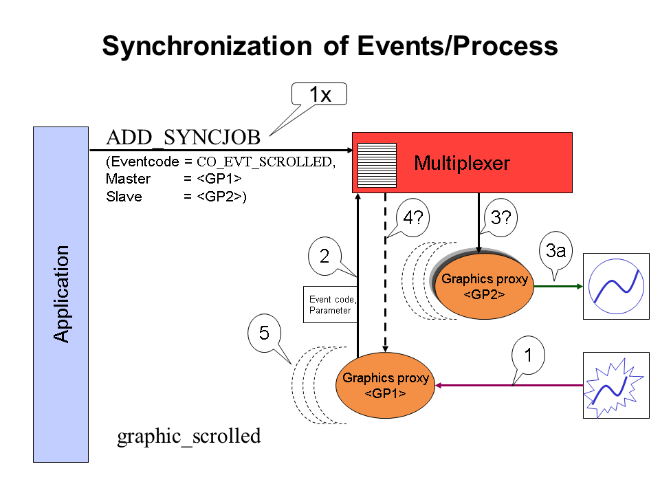 4+5: In the synchronization job it is specified whether the application is to be informed of the event and if so whether before or after synchronization. If the application is to be informed of the event GRAPHIC_SCROLLED then <GP1> carries this out.