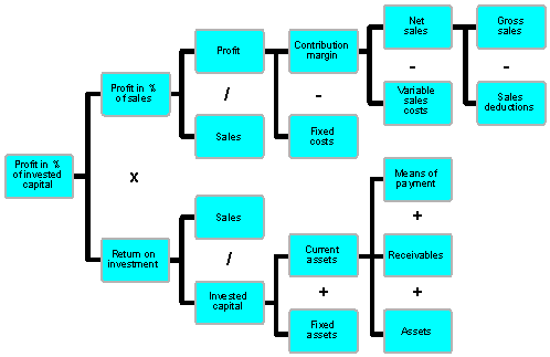 Key figure formulas can comprise the basic key figures of that aspect, constants and existing defined key figures in the aspect, i.e. you can build up tree-like key figure hierarchies (see diagram below). In the presentation there is no distinction between basic key figures and derived key figures.