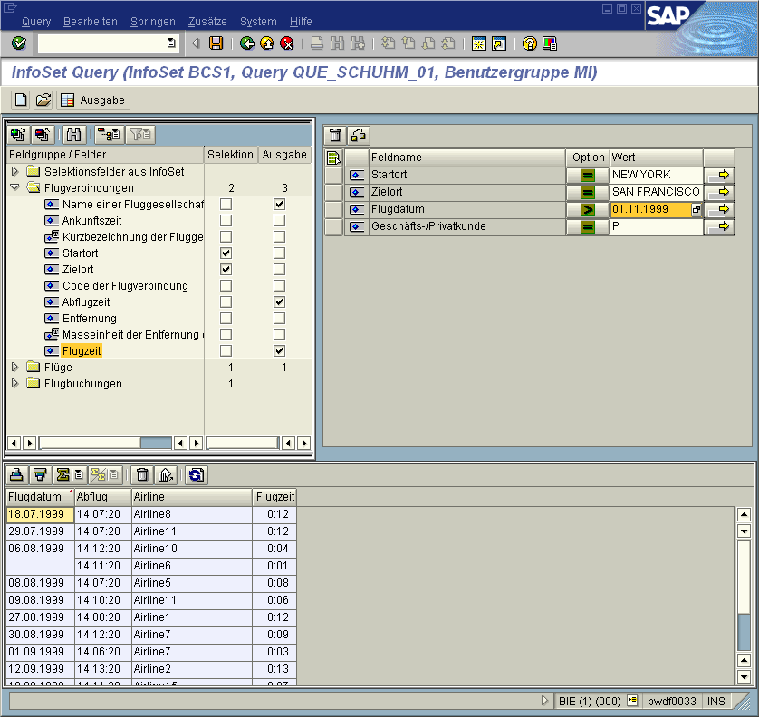 After starting the InfoSet Query, the initial screen is displayed. The initial screen is divided into three areas, containing all the necessary information to create, change and execute a query. Aside from a few dialog boxes, this is the only screen for the InfoSet Query.