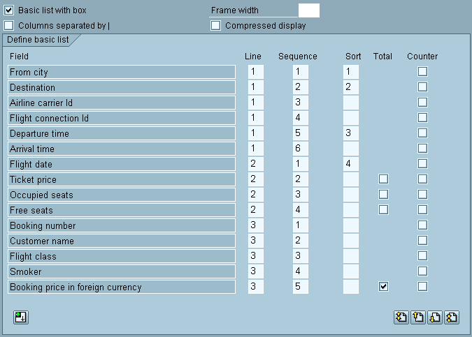 In the Basic List Line Structure screen, extend the definition of the basic list. Specify which field you want to sum. Also mark the Total checkbox for the Booking Price in Foreign Currency line.