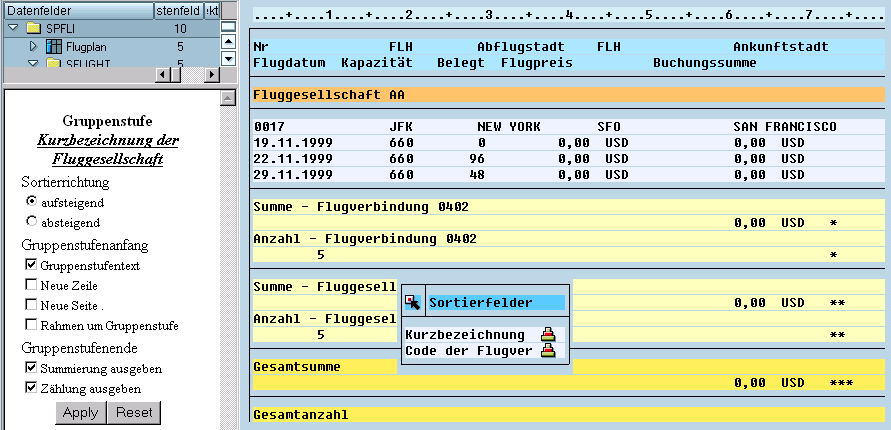 This QuickView is sorted according to the fields Airline ID and Flight connection code. After you drag these two fields to the Sort fields toolbar, the control level texts automatically appear above your list fields. Subtotals are displayed below the list's numeric fields.