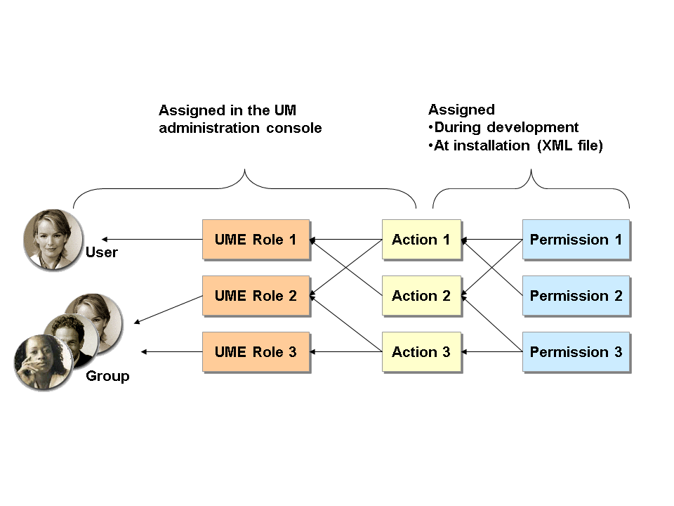 The user management administration console is an application running on the UME. The application defines permissions in the code for activities such as changing a user's profile or modifying roles. In the XML file an action Manage_Roles is defined that groups together all permissions that a user requires to administrate roles. This action includes permissions for viewing, modifying, and deleting roles.