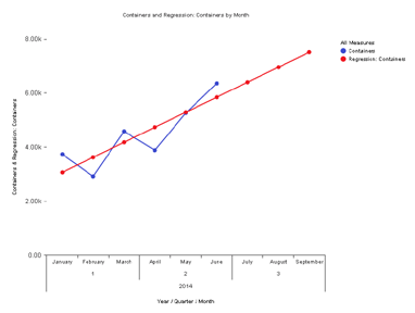 Puede aplicar a sus datos una regresión lineal para visualizar una tendencia lineal o predecir datos futuros a partir de la tendencia lineal de sus datos. La regresión lineal utiliza como entradas un indicador y una dimensión que formen parte de una jerarquía temporal (por ejemplo, mes).