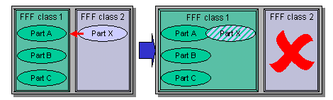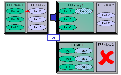If partXis the only part in its FFF class, the system enquires whether you want to assign part X to the FFF class of partA. On confirmation, the system assigns it to the FFF class and sets a deletion indicator on the original FFF class of partX