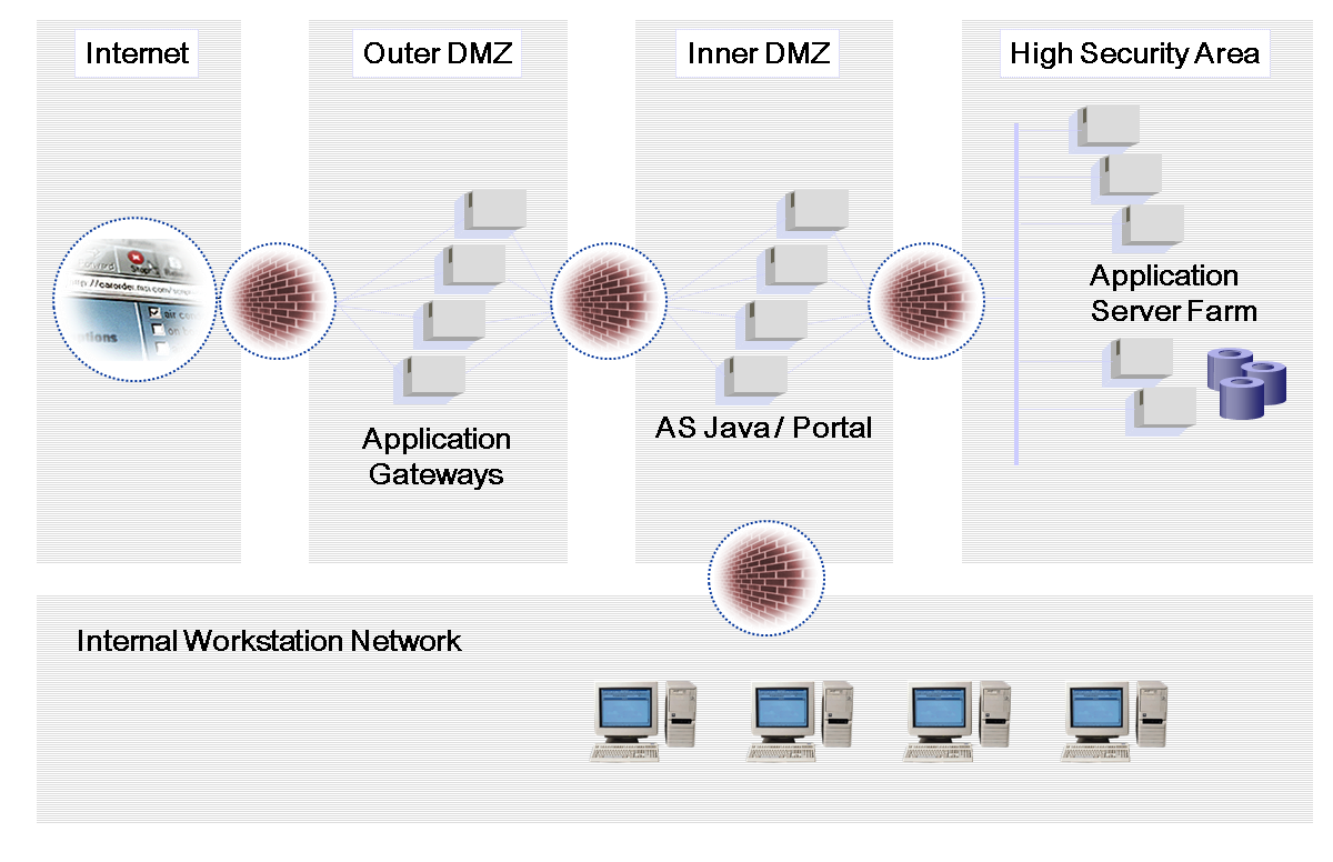 The firewalls protect the network from undesired access from persons or resources outside of the designated area. The application gateway or proxy server in the DMZ makes sure that requests are not directly passed through to the desired resource, but are handled by the gateway or proxy server's own cache. Not only does this buffer zone reduce network load, but it also allows you to filter requests increasingly from the external to internal networks through the multiple firewalls. Application servers, database servers, and the user management systems have increased protection and are only accessible by authorized users or resources. In this way, you can provide for optimal protection.