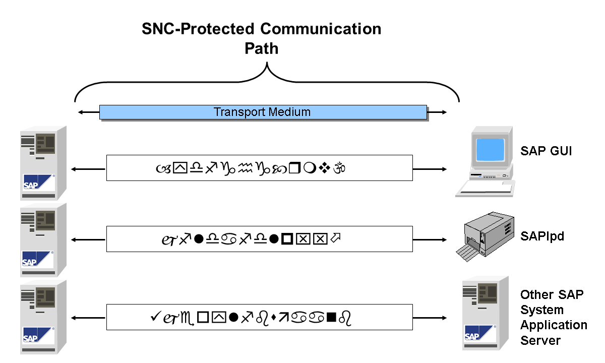 SNC provides security at the application level. This means that a secure connection between the components of the SAP system (for example, between the SAP GUI and the SAP application server) is guaranteed, regardless of the communication link or transport medium (see the following figure). You therefore have a secure network connection between two SNC-enabled communication partners.