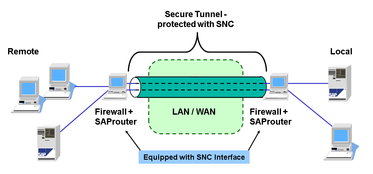 You can also use SNC between two SAProuters to build a secure tunnel between networks (see the following figure).